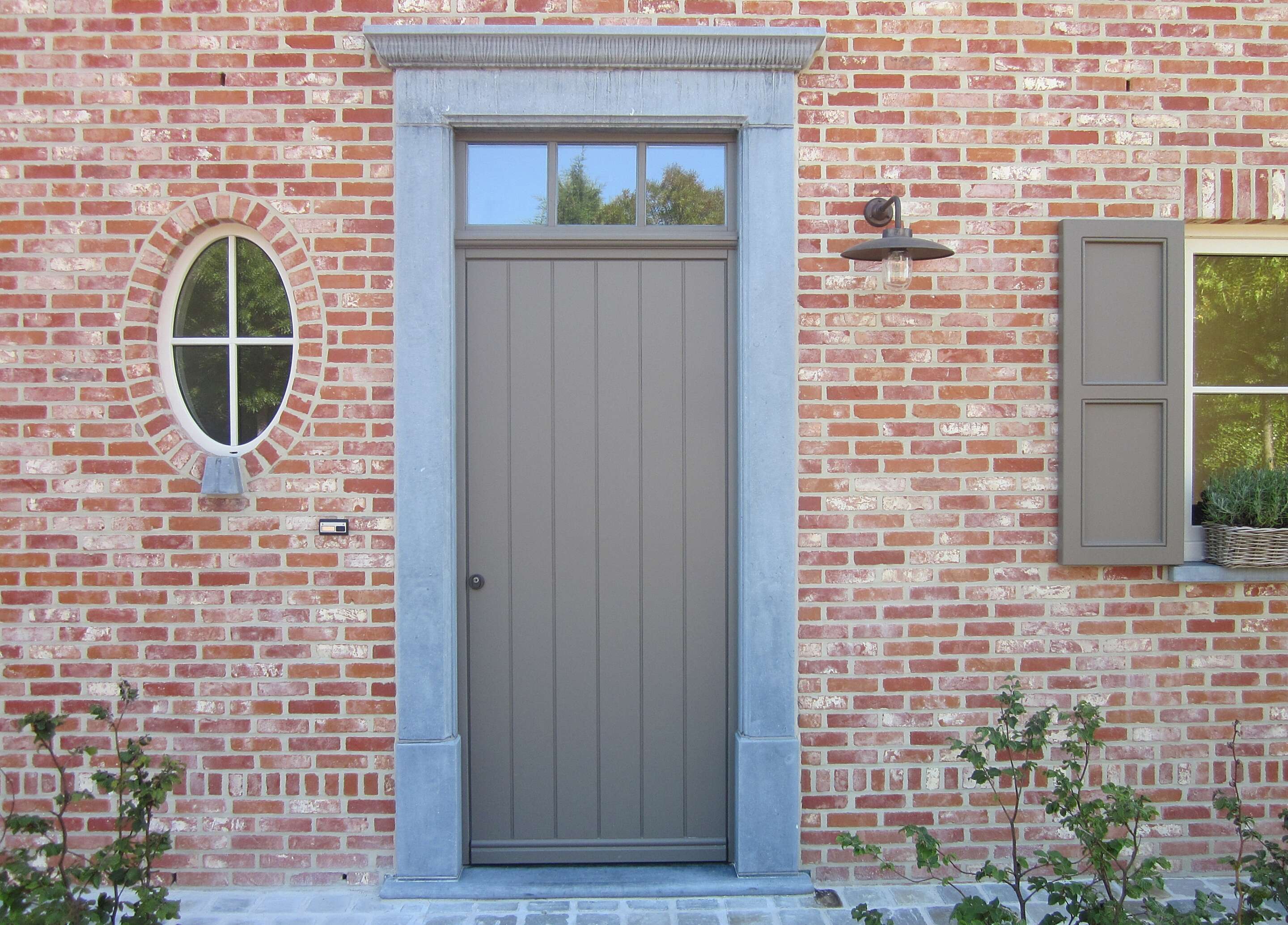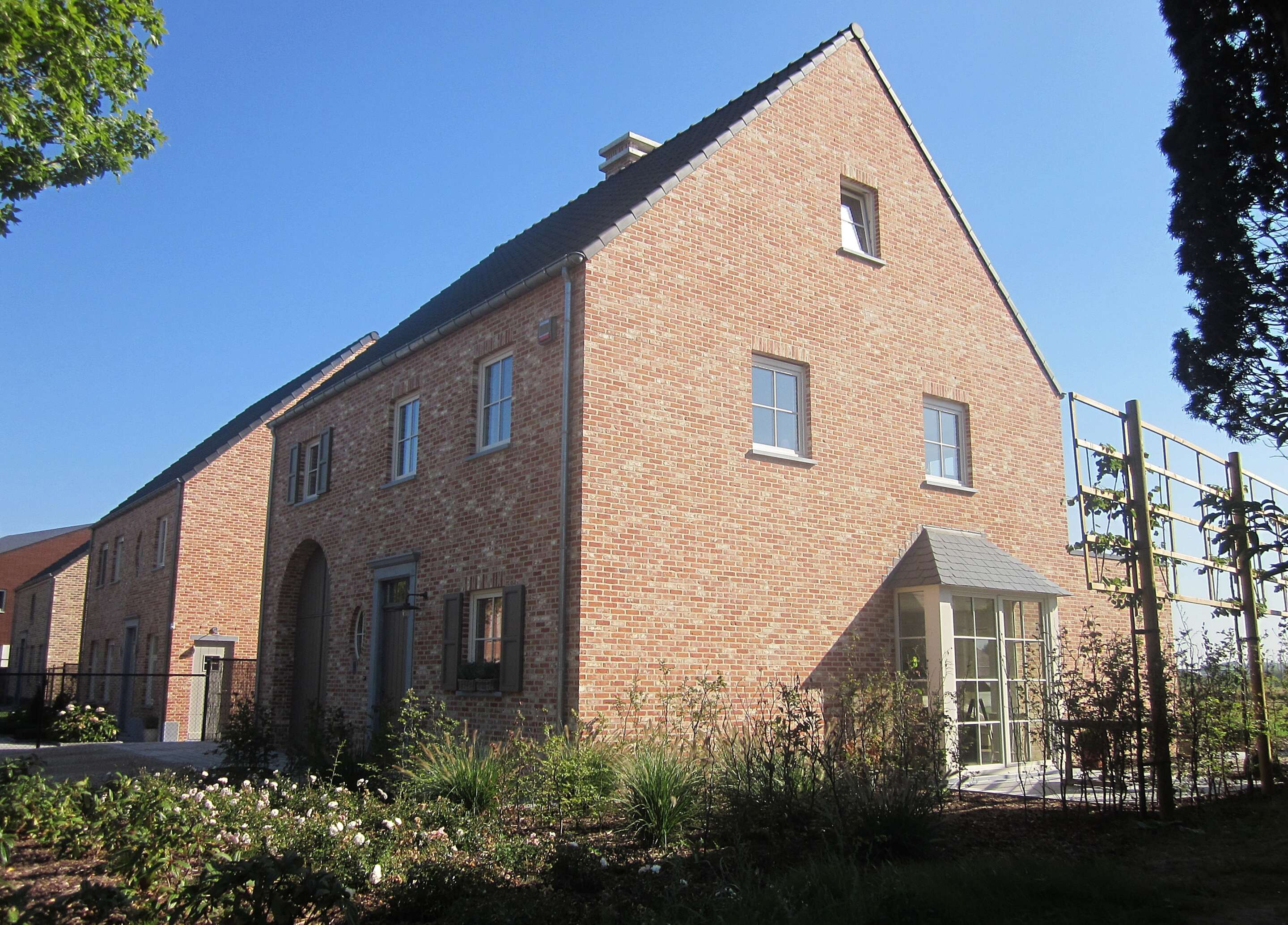 De ramen en zij-erker (met opliggende glasverdelingen) zijn weliswaar in pvc, maar ook deze lichtere kleur werd vrij gekozen uit het ruime ral-kleurenpalet.